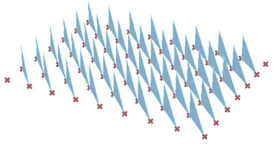 To generate the triangles, we need 3 sets of corner points. Two of the point sets (A, B) are within the grid. B is diagonal from A (relative index is +1 branch and +1 element). The third point set (C) is a copy of set (B) moved vertically. Group corners to connect into boundaries then generate surfaces. |