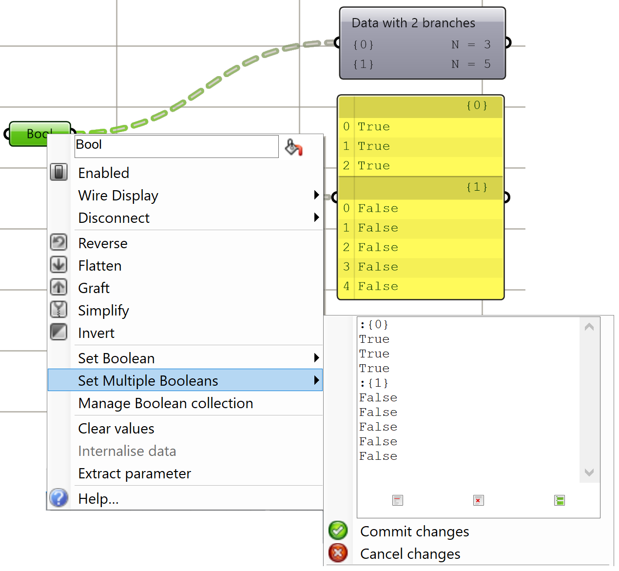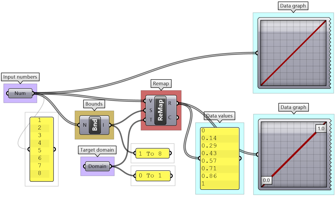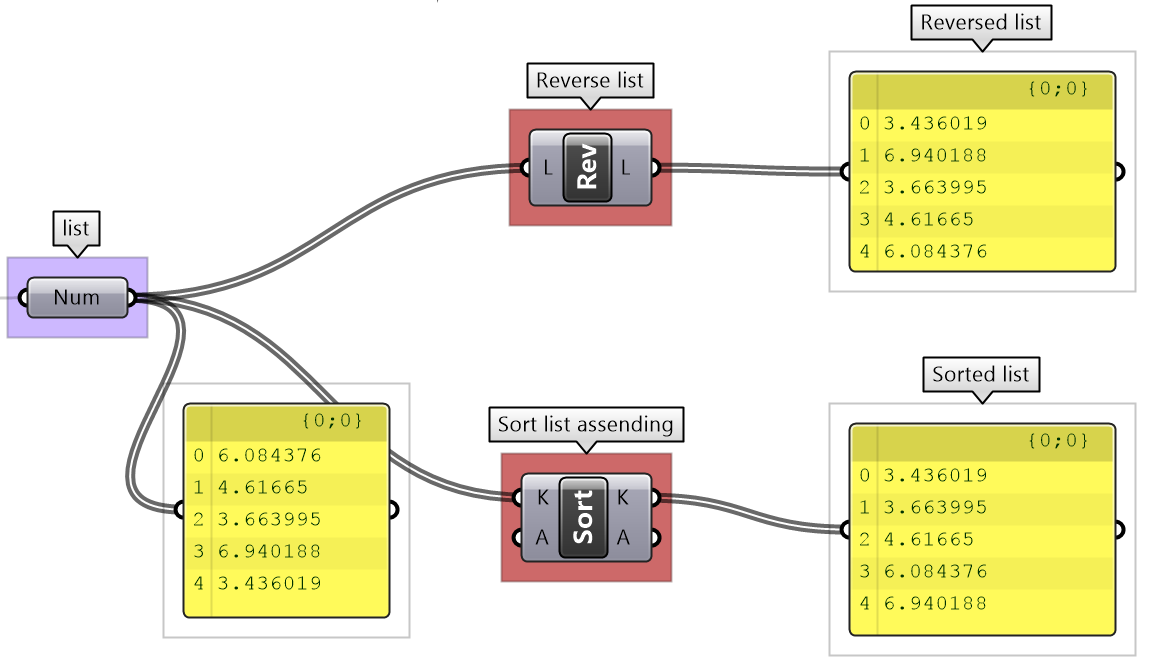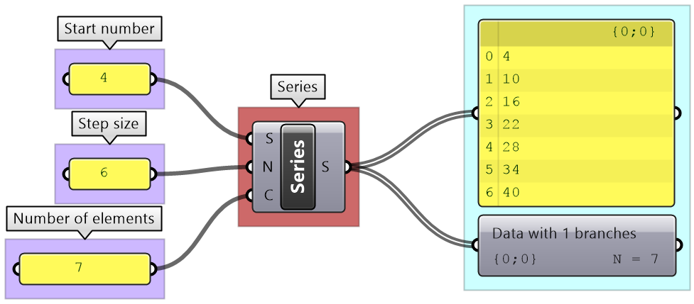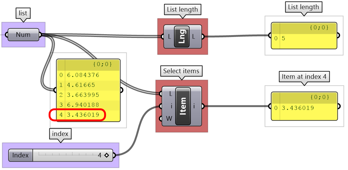 There are many tools in GH to examine and preview data. Panel is used to show the full details of the data and its structure, while the Parameter Viewer shows the data structure only. Other analysis components include Quick Graph that plots data in a graph, and Bounds to find the limits in a given set of numbers (the min and max values in the set).
