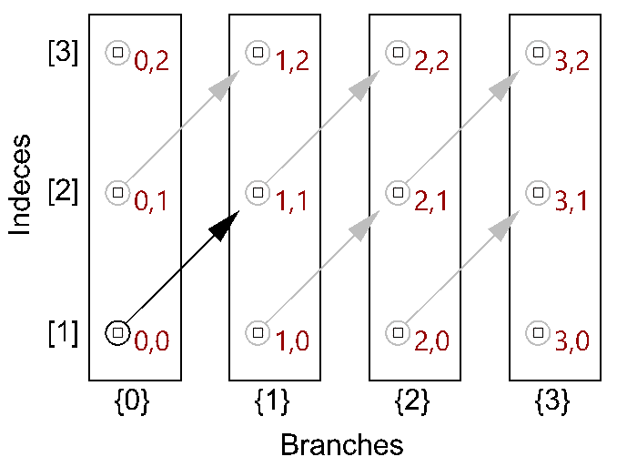 Second, Flip each of the 5 trees. Since the branches has 11 elements each, flipping each tree will create 11 branches with 2 elements in each branch. Total of 55 branches. You flip by switching the last integer of the path with the element index: |