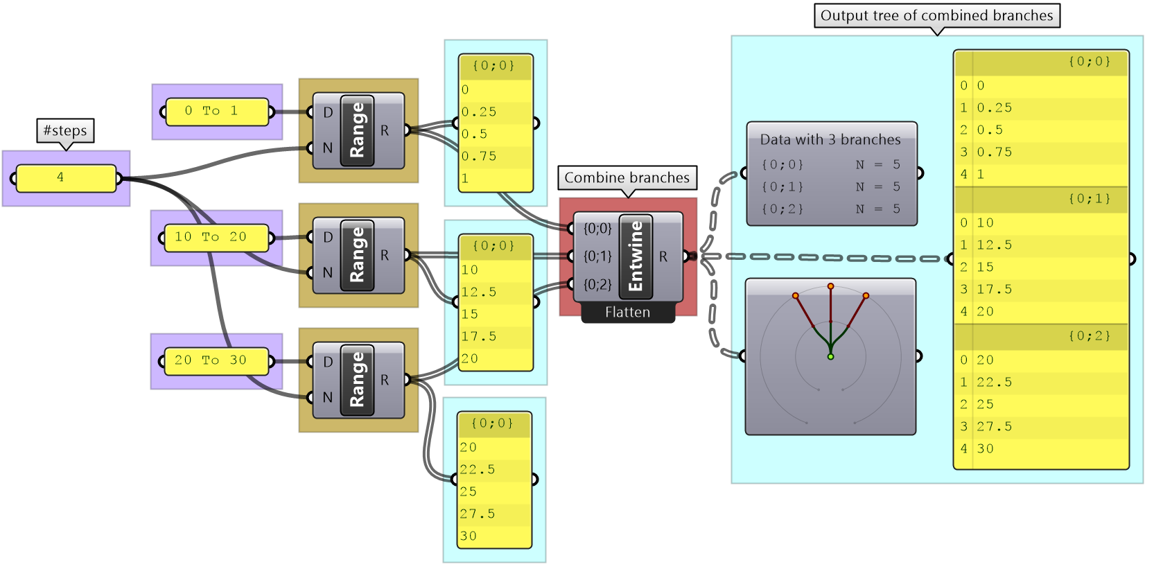 To create the vertical connections, you need to create a branch for each 2 corresponding elements across the 2 trees, then use Polyline to connect them. 1. Analyze the paths of the trees 2. Come up with a mapping that generates the desired grouping | |
