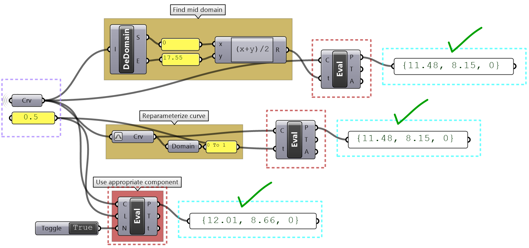 It is worth noting that sometimes GH components simply ignore invalid input (null or wrong type). In such cases, you are likely to end up with an unexpected result and hard to find the bug. It is very important to verify the output from each component before using it.