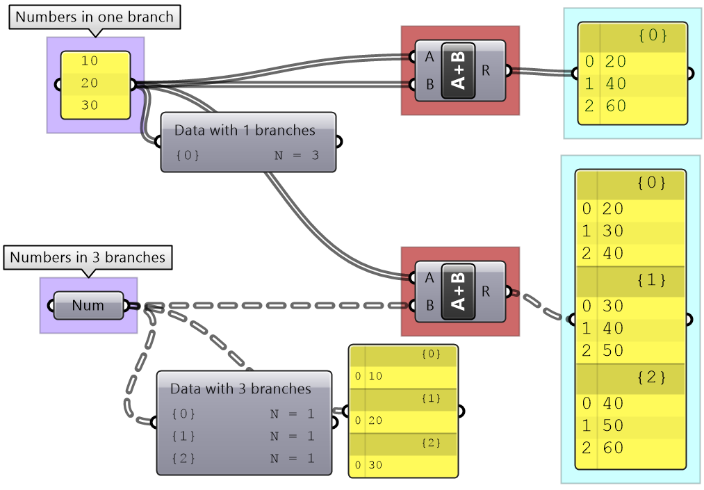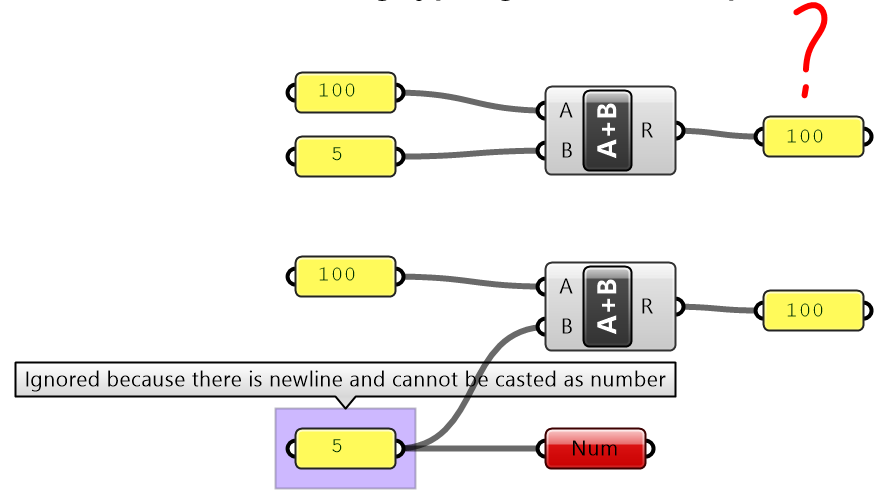 Grasshopper components internally convert the input to suitable types when possible. For example, if you feed a “text” to the Addition component, GH tries to read the text as a number. If a component can process more than one type, it uses the input type without conversion. For example, equality in an expression can compare text as well as numbers. In such a case, make sure you use the intended type to avoid confusion.