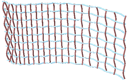 The input is a planar square grid with vertical branches. For vertical threads: Split the grid into two parts alternating elements in each branch. Move the first part up, and the second down, then recombine the parts into one set. Draw a curve through the points in each branch. Flip the grid, then repeat to create horizontal curves. |