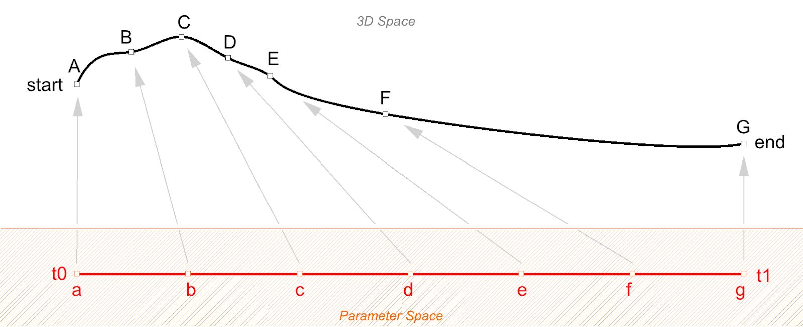 1. Reparameterize the input curves. We do that so that we know that the start of the curve evaluates at t=0 and the end at t=1.