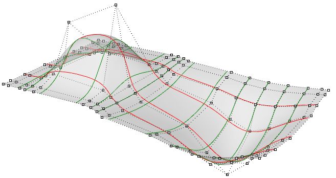 Figure 63: NURBS surface with red isocurves in the u-direction and green isocurves in the v-direction.